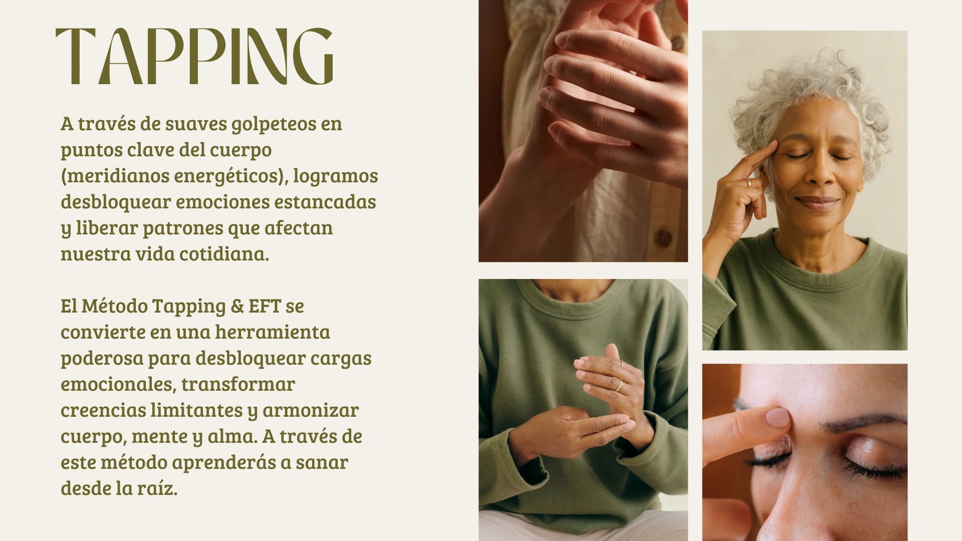 Es una técnica de liberación emocional que combina toques suaves en puntos clave del cuerpo con frases conscientes. Te ayuda a calmar la ansiedad, liberar el estrés y soltar emociones que te pesan... en solo 10 minutos.